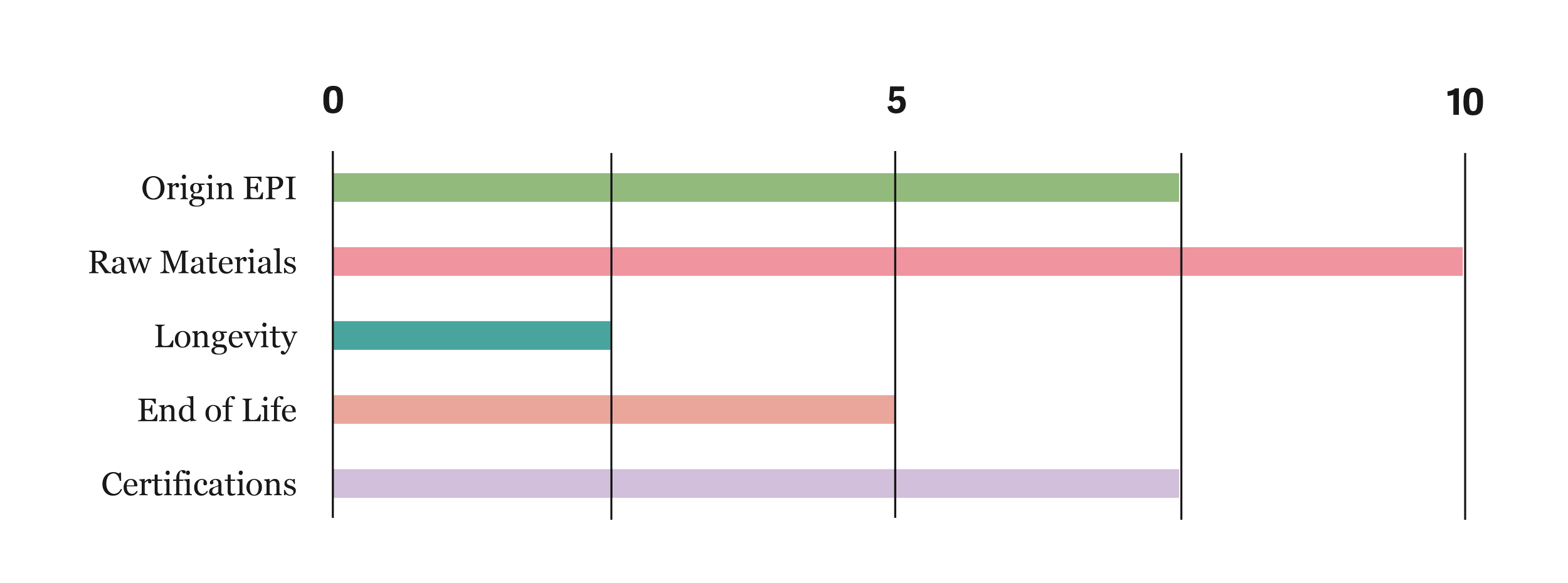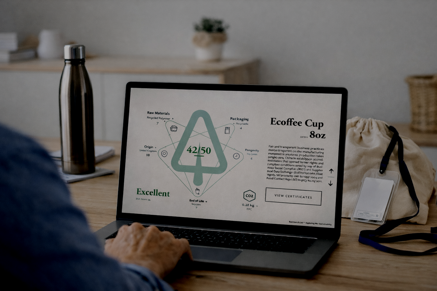 Evermerch independently evaluates promotional products using AI scoring across 5 clear criteria: Origin (EPI), Raw Materials, Longevity, Packaging, End of Life—plus certifications and manufacturer initiatives.